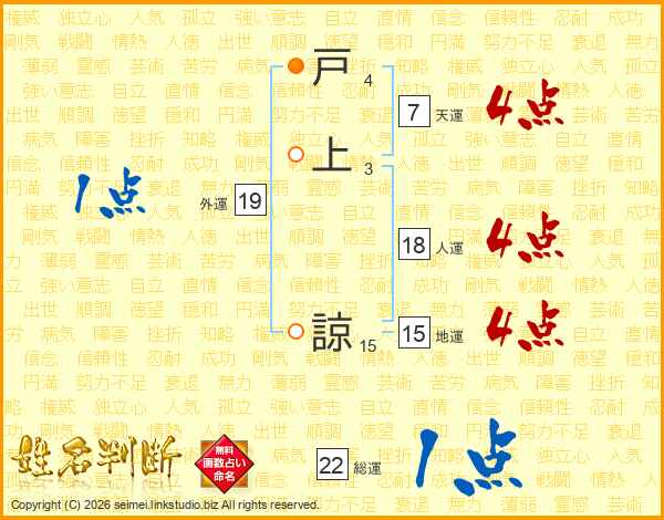 戸(4画)上(3画) 諒(15画)