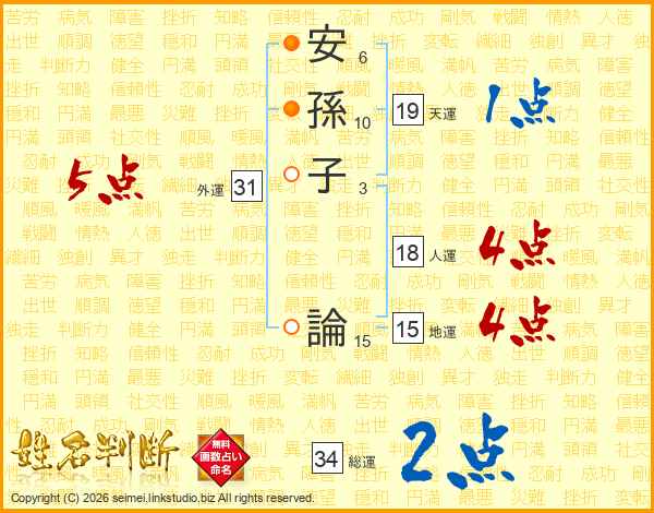 あなたの人生を表す1番重要な運勢です。生涯を通じて影響する総合運となり、主に50歳以降の晩年期に影響を及ぼします。苗字と名前の合計画数。
