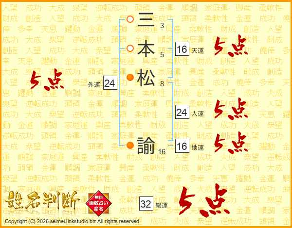 あなたの人生を表す1番重要な運勢です。生涯を通じて影響する総合運となり、主に50歳以降の晩年期に影響を及ぼします。苗字と名前の合計画数。