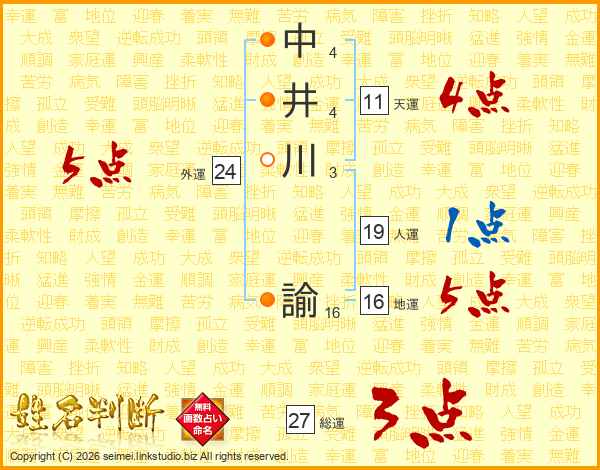生活面を象徴する運勢です。外部から受ける影響力を表し、結婚運、家庭運や職場、環境への順応性を表します。総運から人運を引いた画数。姓や名が1文字の場合を除く。
