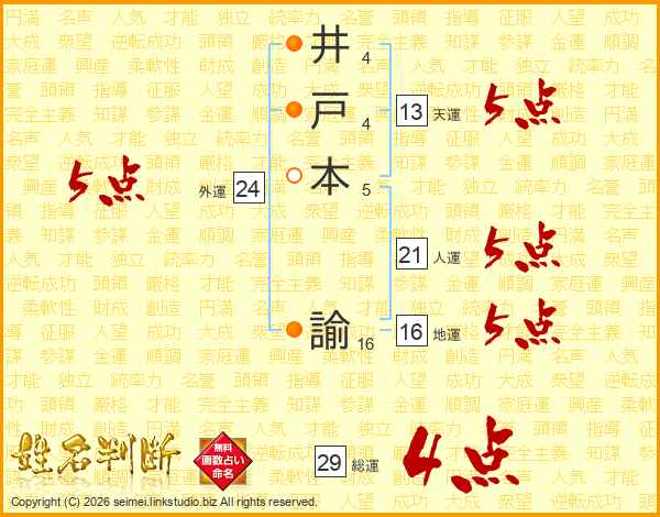 井戸本諭さんの総運は29画の4点!