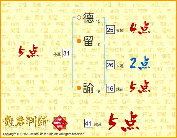 德留諭さんの総運は41画の5点!