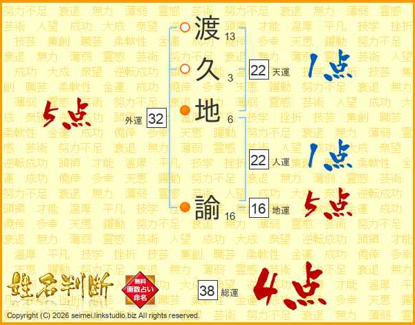 生活面を象徴する運勢です。外部から受ける影響力を表し、結婚運、家庭運や職場、環境への順応性を表します。総運から人運を引いた画数。姓や名が1文字の場合を除く。
