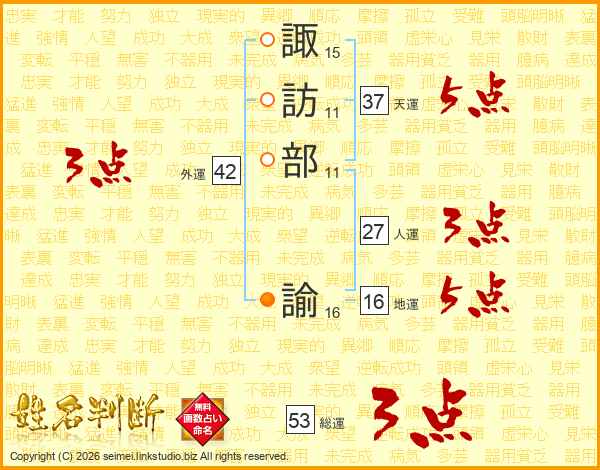 諏訪部諭さんの総運は53画の3点!