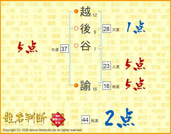 越後谷諭さんの総運は44画の2点!