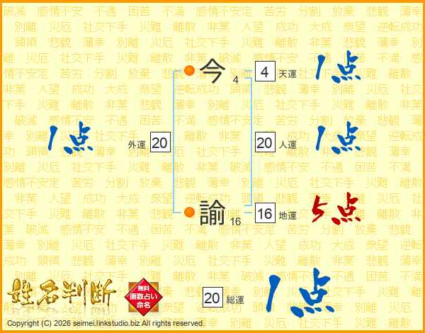 生活面を象徴する運勢です。外部から受ける影響力を表し、結婚運、家庭運や職場、環境への順応性を表します。総運から人運を引いた画数。姓や名が1文字の場合を除く。