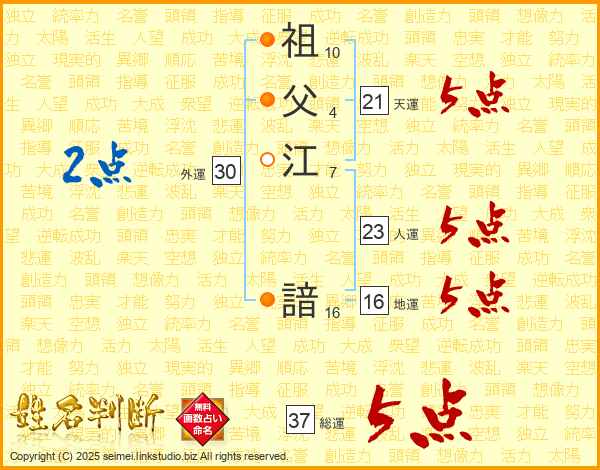 家系が持つ宿命的な運勢を表します。祖先から受け継いだ苗字ですので自分の力が及びません。家柄を象徴します。苗字の合計画数。