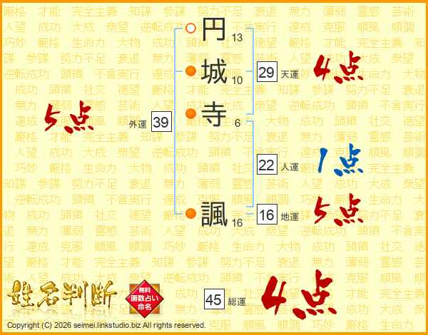 あなたの人生を表す1番重要な運勢です。生涯を通じて影響する総合運となり、主に50歳以降の晩年期に影響を及ぼします。苗字と名前の合計画数。