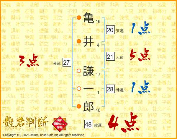 亀(16画)井(4画) 謙(17画)一(1画)郎(10画)