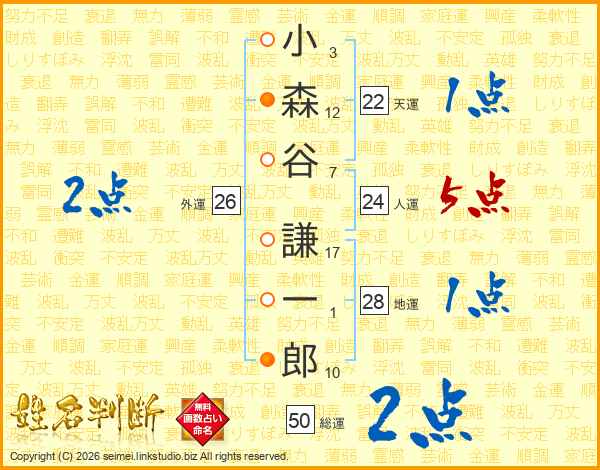 小(3画)森(12画)谷(7画) 謙(17画)一(1画)郎(10画)