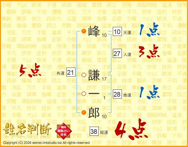 峰(10画) 謙(17画)一(1画)郎(10画)