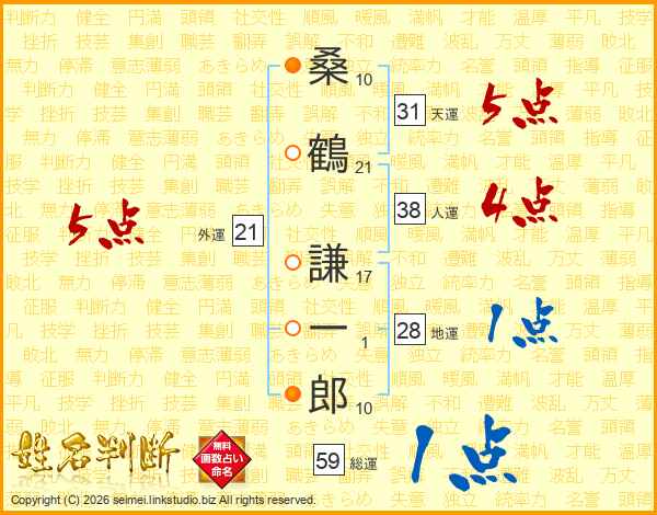 桑(10画)鶴(21画) 謙(17画)一(1画)郎(10画)