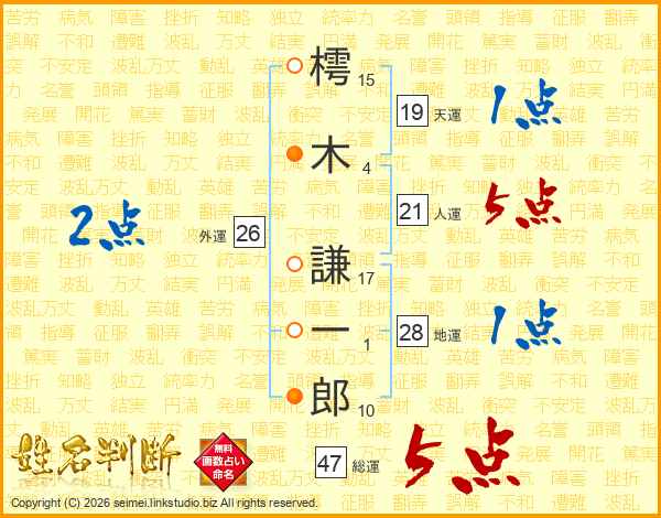 樗(15画)木(4画) 謙(17画)一(1画)郎(10画)