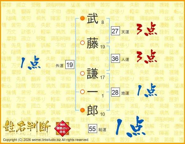 武(8画)藤(19画) 謙(17画)一(1画)郎(10画)