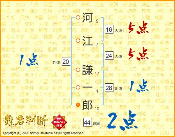 河(9画)江(7画) 謙(17画)一(1画)郎(10画)