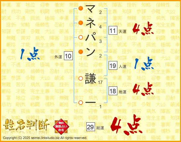 マ(2画)ネ(4画)パ(3画)ン(2画) 謙(17画)一(1画)