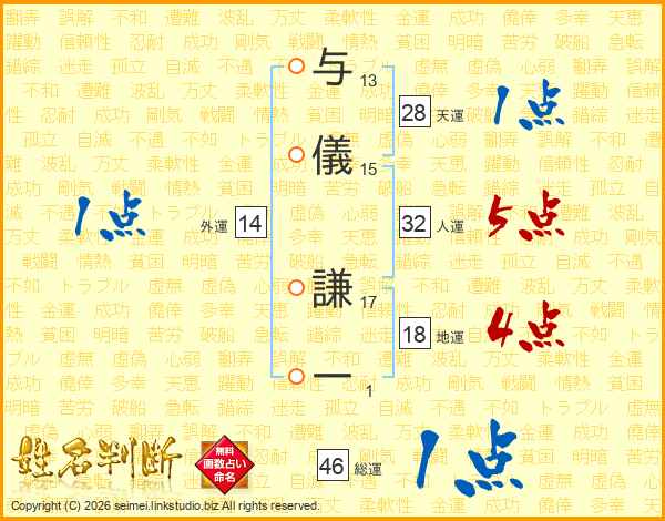 生活面を象徴する運勢です。外部から受ける影響力を表し、結婚運、家庭運や職場、環境への順応性を表します。総運から人運を引いた画数。姓や名が1文字の場合を除く。