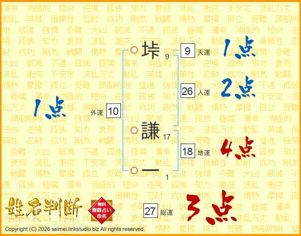 生活面を象徴する運勢です。外部から受ける影響力を表し、結婚運、家庭運や職場、環境への順応性を表します。総運から人運を引いた画数。姓や名が1文字の場合を除く。