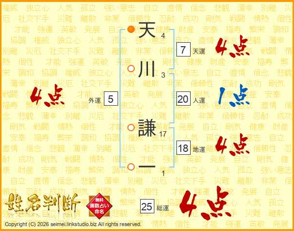 生活面を象徴する運勢です。外部から受ける影響力を表し、結婚運、家庭運や職場、環境への順応性を表します。総運から人運を引いた画数。姓や名が1文字の場合を除く。