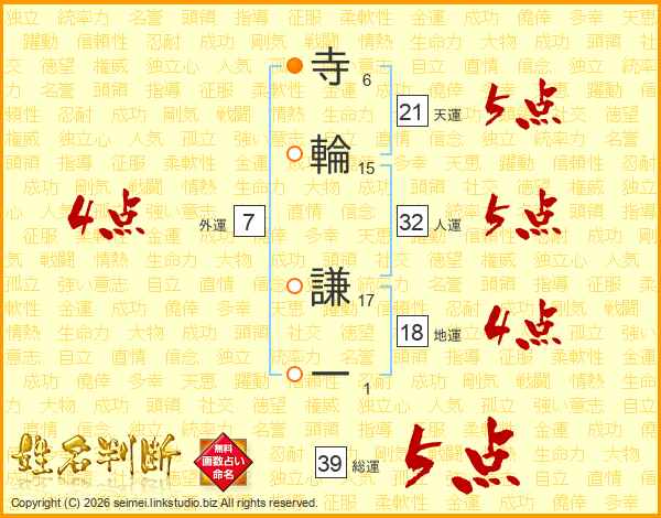 寺(6画)輪(15画) 謙(17画)一(1画)