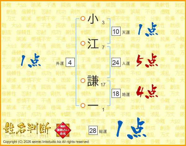 生活面を象徴する運勢です。外部から受ける影響力を表し、結婚運、家庭運や職場、環境への順応性を表します。総運から人運を引いた画数。姓や名が1文字の場合を除く。