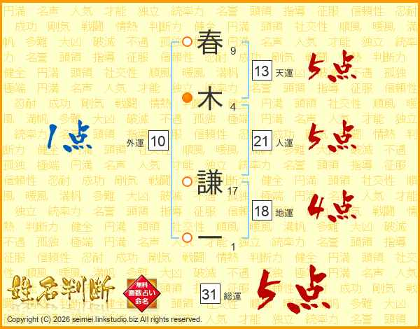 生活面を象徴する運勢です。外部から受ける影響力を表し、結婚運、家庭運や職場、環境への順応性を表します。総運から人運を引いた画数。姓や名が1文字の場合を除く。