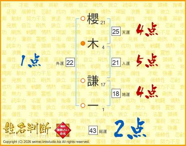 櫻木謙一さんの総運は43画の2点!