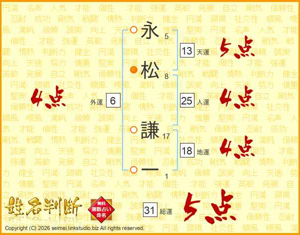 生活面を象徴する運勢です。外部から受ける影響力を表し、結婚運、家庭運や職場、環境への順応性を表します。総運から人運を引いた画数。姓や名が1文字の場合を除く。