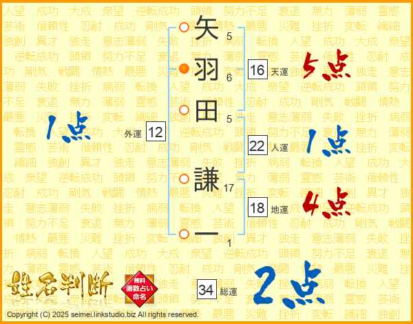矢(5画)羽(6画)田(5画) 謙(17画)一(1画)