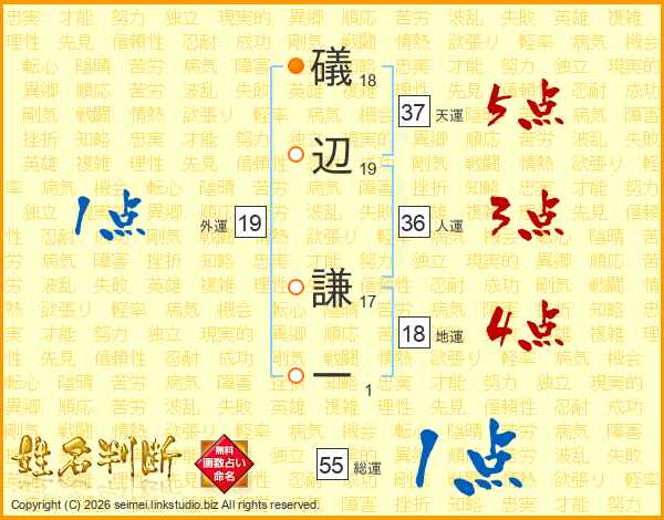 礒(18画)辺(19画) 謙(17画)一(1画)