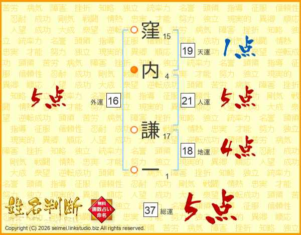 窪内謙一さんの総運は37画の5点!
