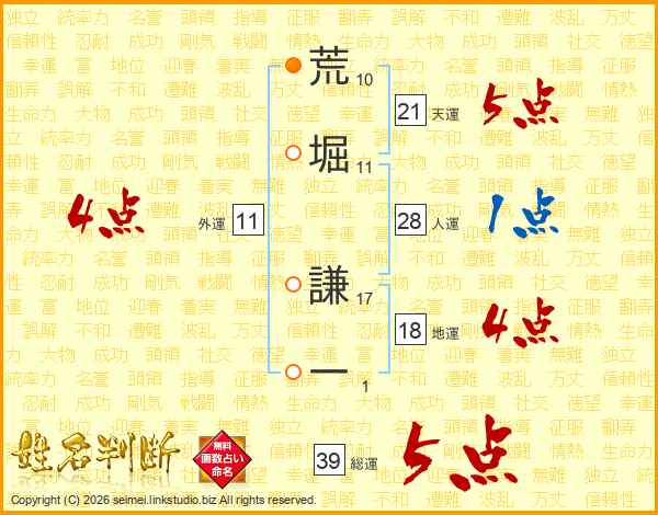 荒堀謙一さんの総運は39画の5点!
