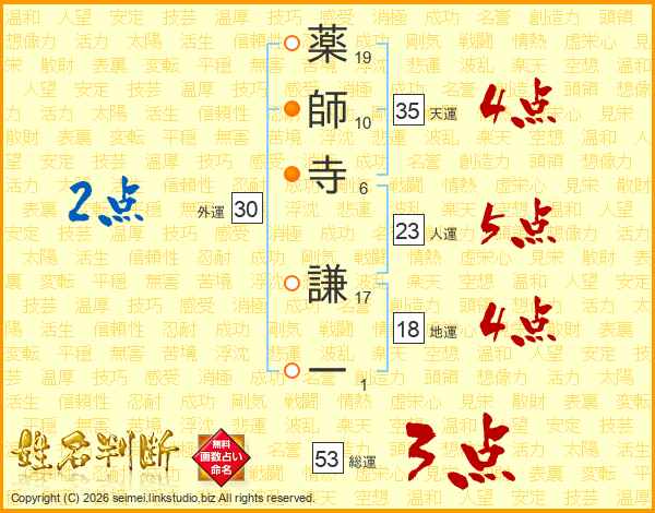 薬(19画)師(10画)寺(6画) 謙(17画)一(1画)