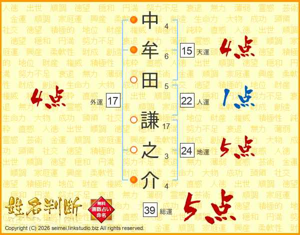 中(4画)牟(6画)田(5画) 謙(17画)之(3画)介(4画)