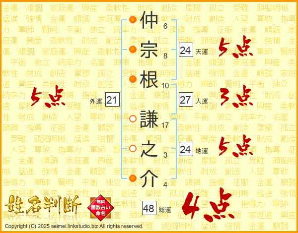 仲(6画)宗(8画)根(10画) 謙(17画)之(3画)介(4画)