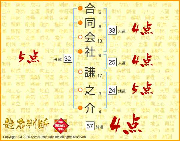 合(6画)同(6画)会(13画)社(8画) 謙(17画)之(3画)介(4画)