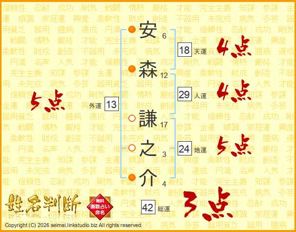 安(6画)森(12画) 謙(17画)之(3画)介(4画)