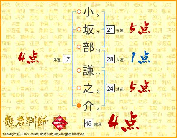 小(3画)坂(7画)部(11画) 謙(17画)之(3画)介(4画)