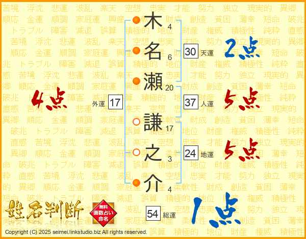 木(4画)名(6画)瀬(20画) 謙(17画)之(3画)介(4画)