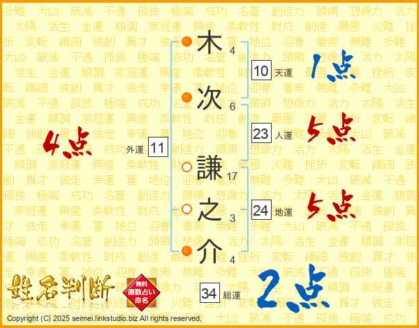 木(4画)次(6画) 謙(17画)之(3画)介(4画)