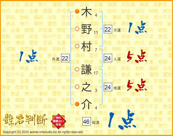 木(4画)野(11画)村(7画) 謙(17画)之(3画)介(4画)