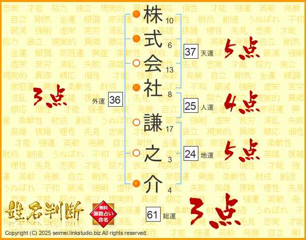 株(10画)式(6画)会(13画)社(8画) 謙(17画)之(3画)介(4画)