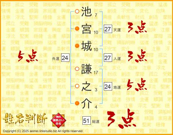 池(7画)宮(10画)城(10画) 謙(17画)之(3画)介(4画)