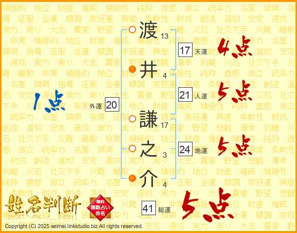 渡(13画)井(4画) 謙(17画)之(3画)介(4画)