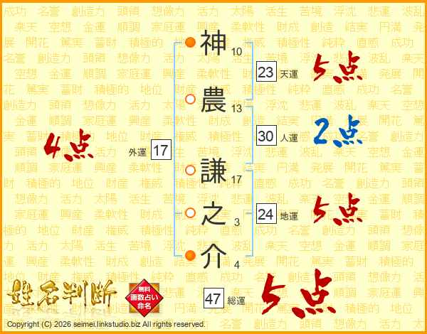 神(10画)農(13画) 謙(17画)之(3画)介(4画)