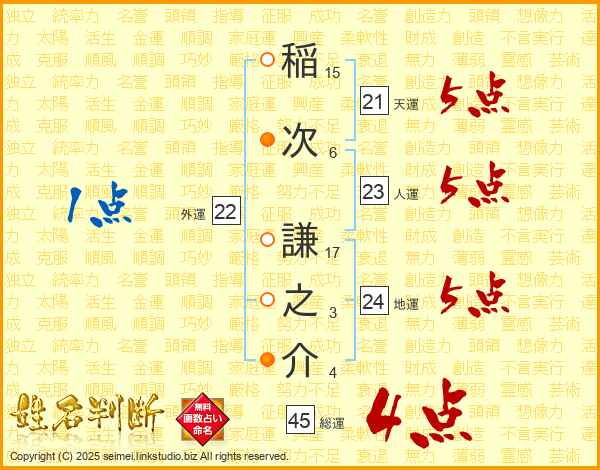 稲(15画)次(6画) 謙(17画)之(3画)介(4画)