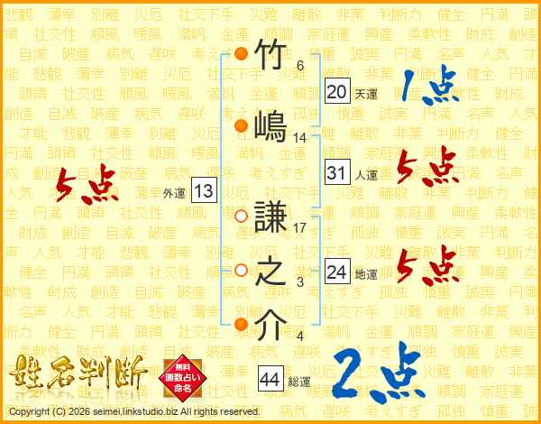 竹(6画)嶋(14画) 謙(17画)之(3画)介(4画)