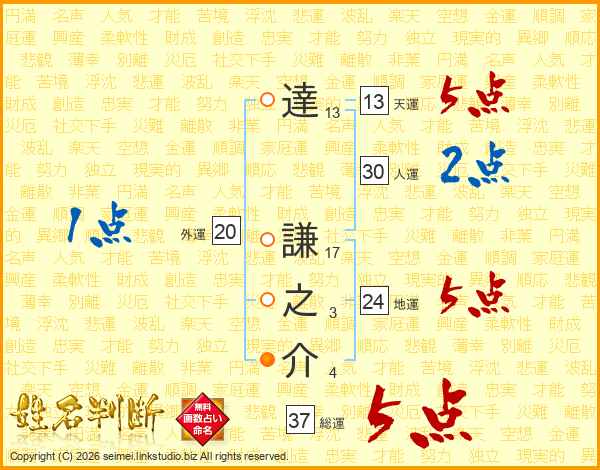 達謙之介さんの総運は37画の5点!