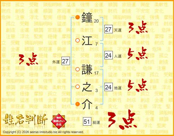 鐘(20画)江(7画) 謙(17画)之(3画)介(4画)