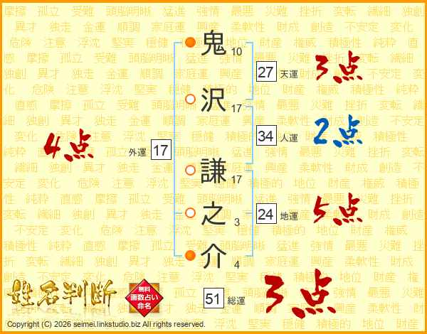 鬼沢謙之介さんの総運は51画の3点!